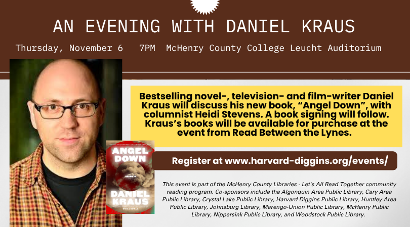 New York Times bestselling novel-, television- and film-writer Daniel Kraus will discuss his new book, “Angel Down”, with nationally syndicated columnist Heidi Stevens on Thursday, November 6 at 7PM at McHenry County College’s Leucht Auditorium, 8900 U.S. Hwy. 14, Crystal Lake. A book signing will follow.  Kraus’s books will be available for purchase at the event from Read Between the Lynes. Register for this event by clicking the RSVP button.  Call 815-943-4671 for more information.