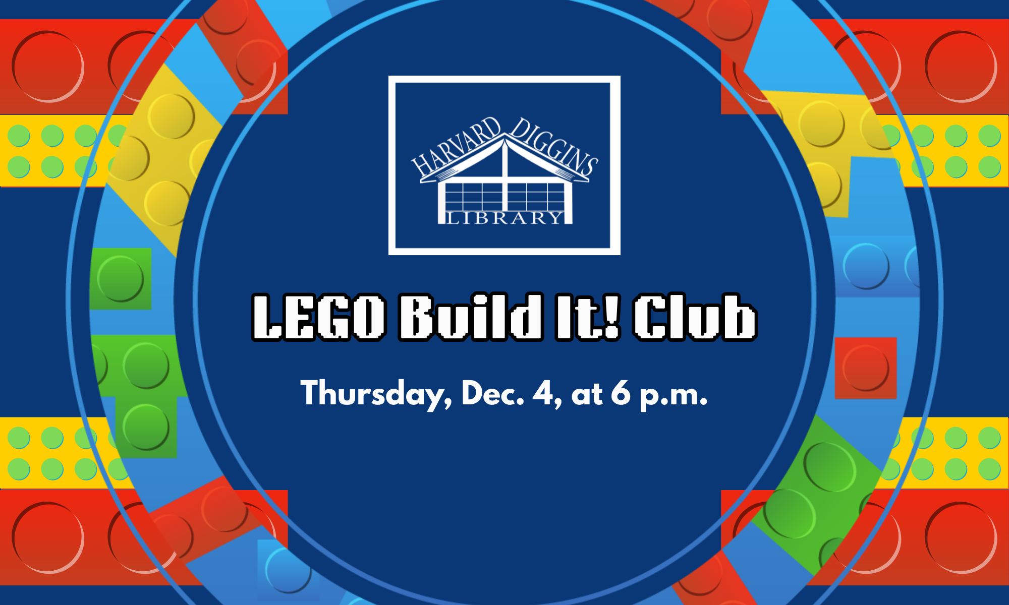 Join Harvard Diggins Library as we tackle a new challenge using Legos each month! All ages welcome! RSVP below. Registration opens on Monday, October 27th.