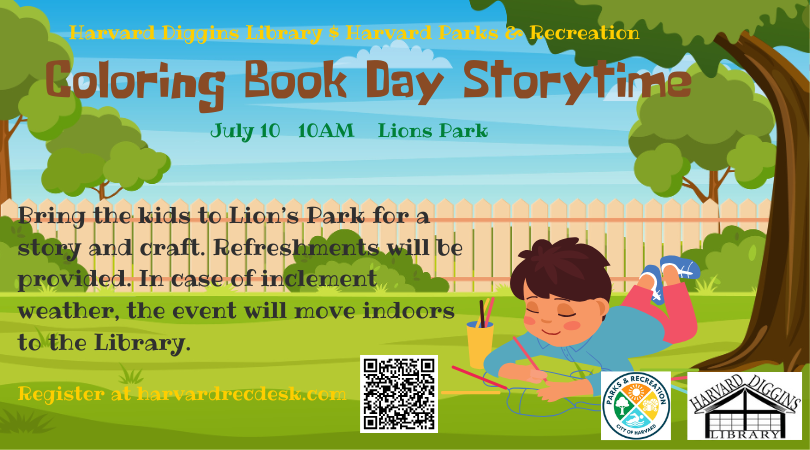 Bring the kids to Lion’s Park for a story and craft. Refreshments will be provided. In case of inclement weather, the event will move indoors to the Library. This activity is in partnership with Harvard Parks and Recreation. Register at https://harvard.recdesk.com/Community/Program/Detail?programId=81. Call 815-943-4671 for more information.