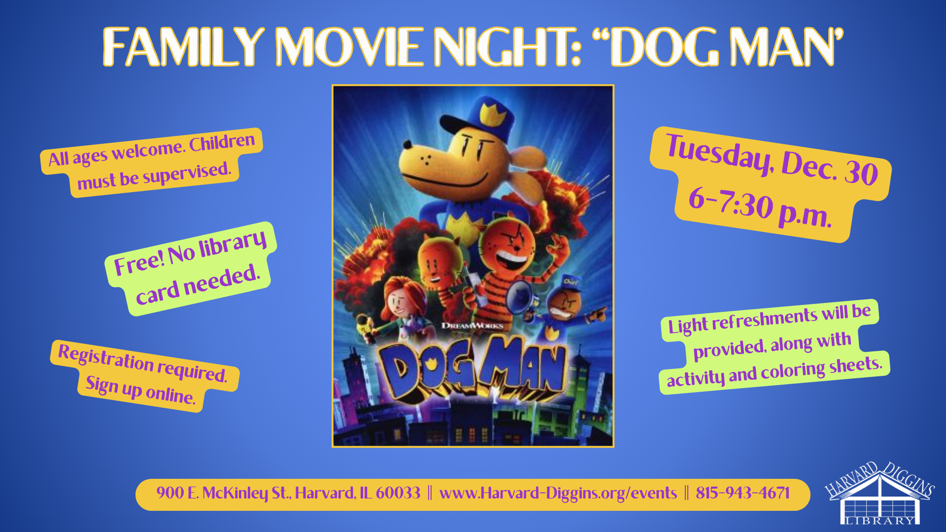 Enjoy a movie night at Harvard Diggins Library with a showing of the 2025 film “Dog Man,” based on the best-selling book series by Dav Pilkey! Light refreshments, as well as activity and coloring sheets, will be provided. All Ages. Children must be supervised. Free! No library card required. RSVP below. Registration opens on Monday, October 27th.