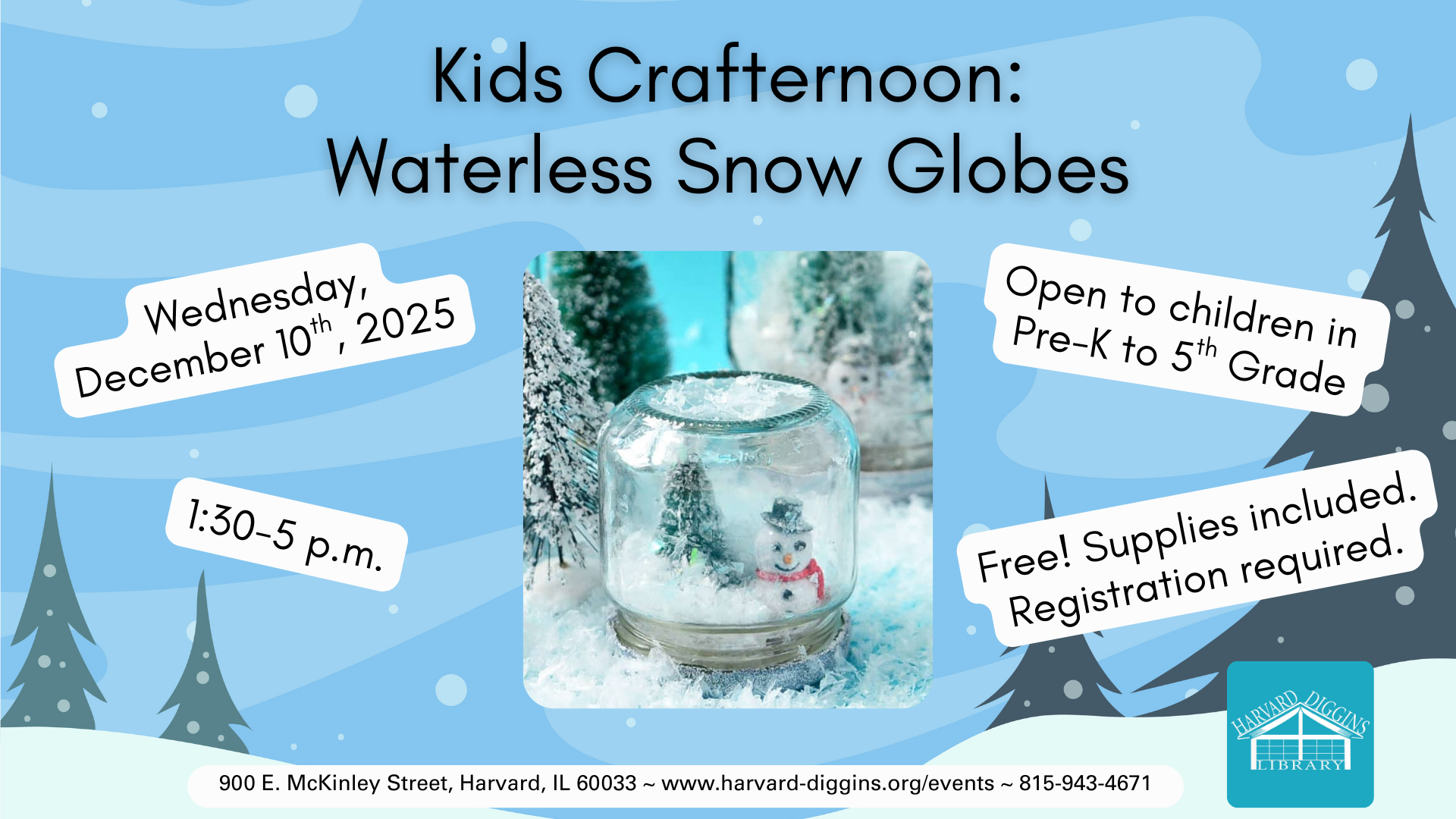 Join us for a festive Kids Crafternoon, where we will be creating wintry snow globes without water! Open to children in Pre-K to 5th grade. Younger children may require adult supervision. Registration Required. Supplies are included in registration. Free! No library card required. Registration opens on Monday, October 27th.