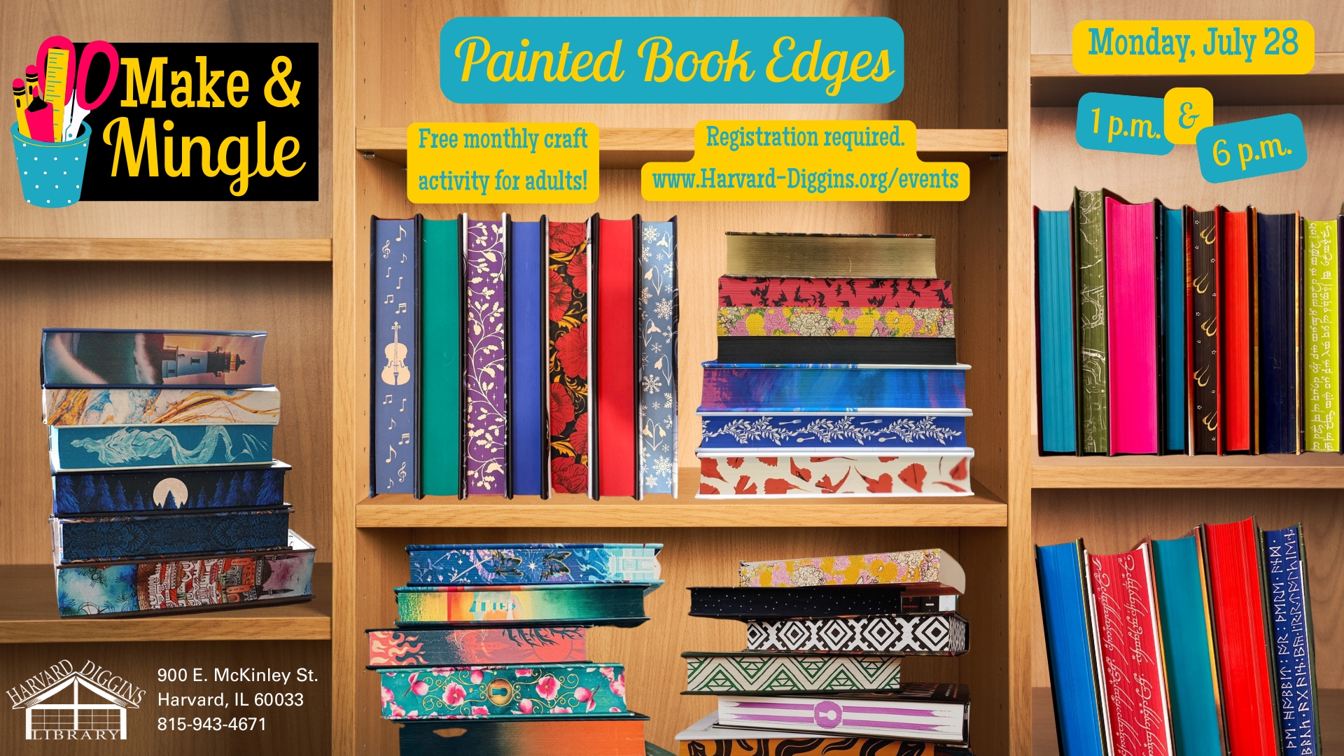 Join us for Make & Mingle, the library’s monthly craft activity for adults. Have you ever heard of book page edge painting? We have a variety of new paperbacks for you to choose from. Then, you can customize your book by painting the page edges in a beautiful one-of-a-kind design that you can enjoy as you flip through and read. This activity is FREE and open to the public – no library card needed. Advance registration is required to attend. To sign up, fill out the form below after May 1. An additional session is available at 6 p.m.
