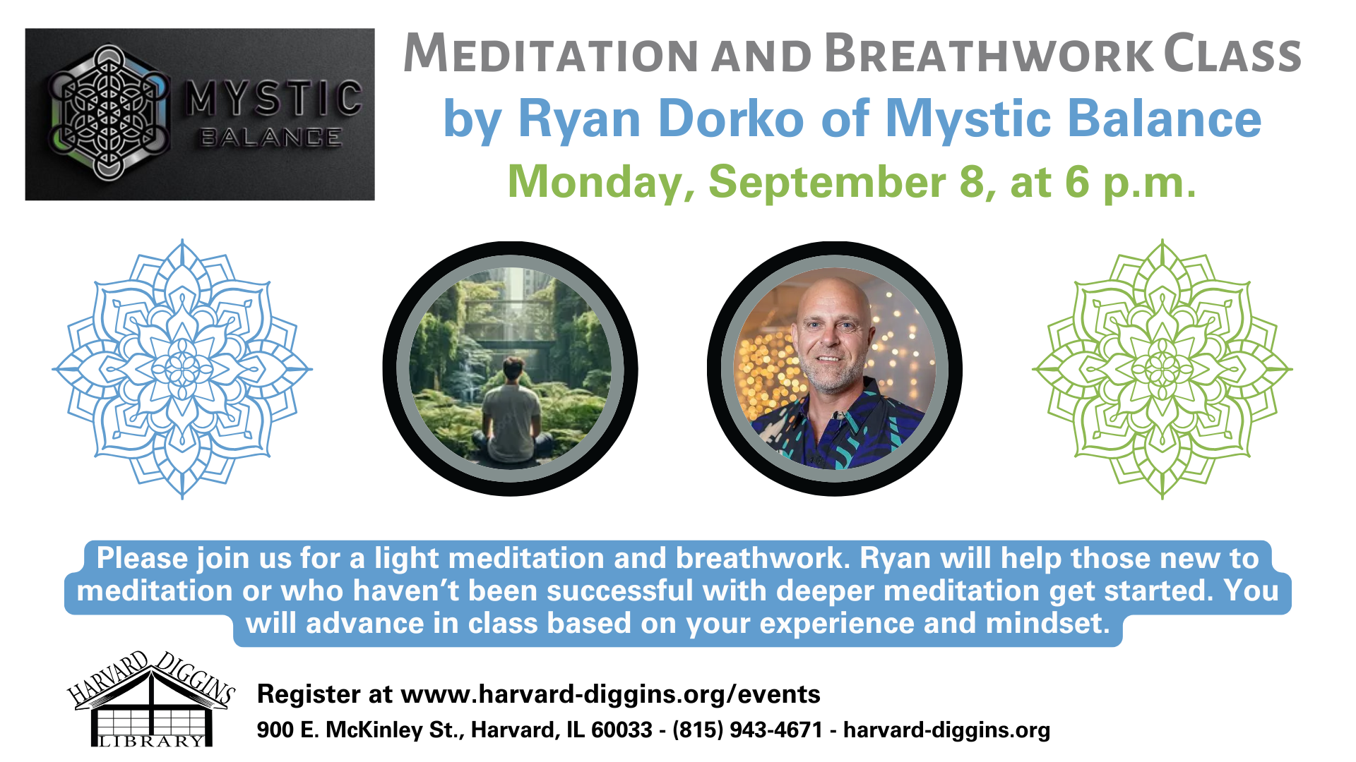 Ryan Dorko of Mystic Balance will lead a light meditation and breathwork class that is for beginners and more experienced meditators. Ryan will help those who are new to meditation or have not had success with traditional meditation get started. Meditators will advance in the class based on their experience and mindset. This activity is FREE and open to the public – no library card needed. Registration is required. To sign up, please fill out the form below. Registration for fall programs will open on Monday, July 28.