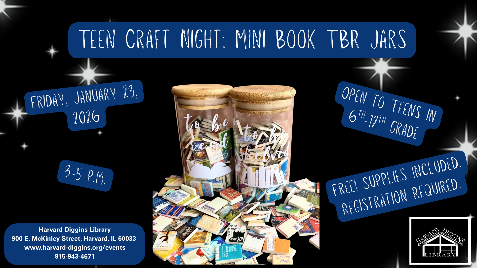 Join us at Harvard Diggins Library for a fun craft decorating TBR (“To Be Read”) Jars and creating mini books to fill them with! All supplies are included in registration! Open to teens in 6th-12th grade. Free! Registration required. Registration opens on Monday, October 27th.